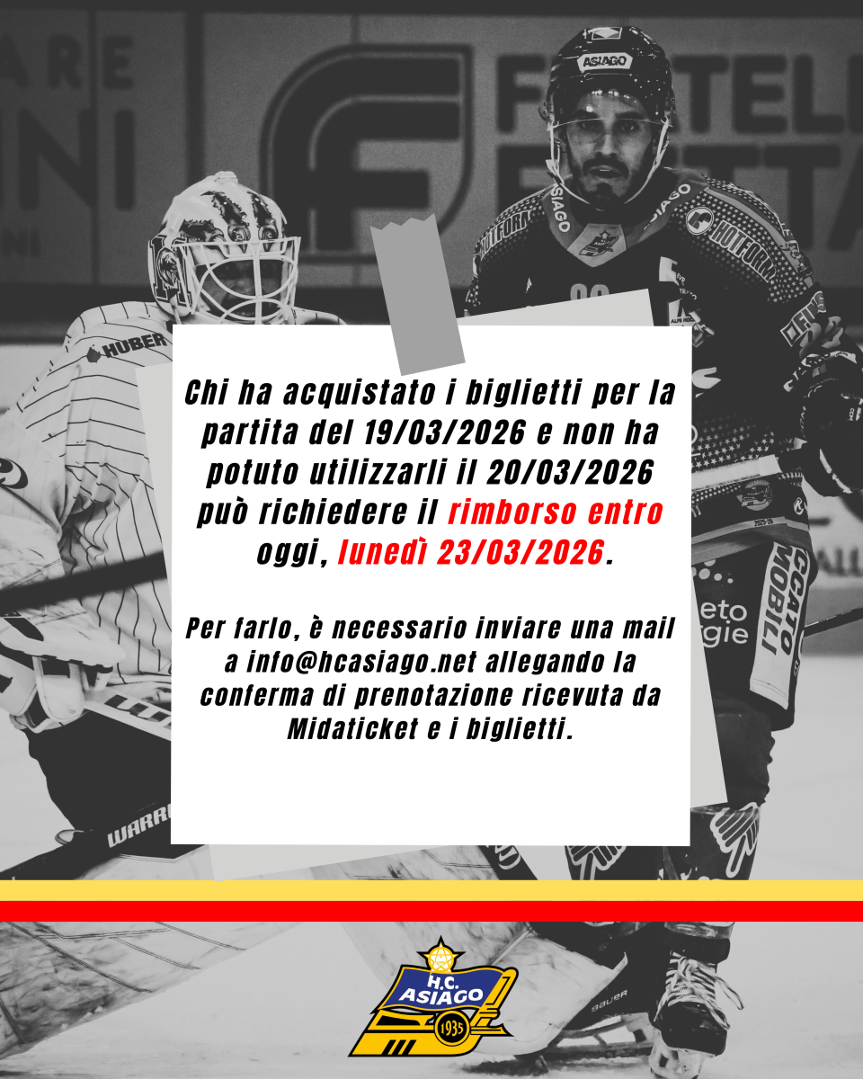 Per farlo, è necessario inviare una mail a info@hcasiago.net allegando la conferma di prenotazione ricevuta da Midaticket e i biglietti.