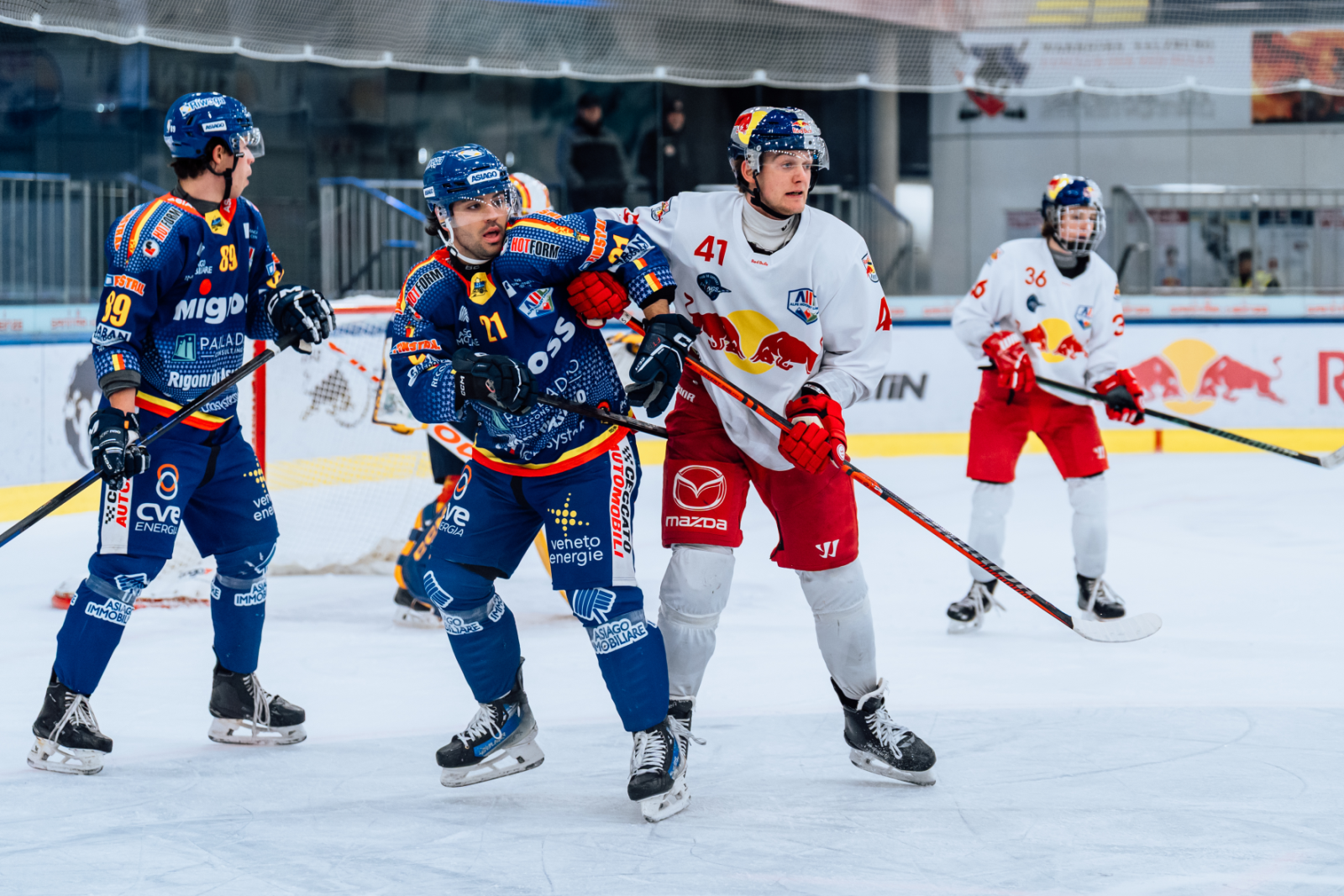 A 10 secondi dalla prima sirena, la Red Bull recupera un disco in difesa, e si propone davanti alla porta di Santangelo, che respinge la prima conclusione, ma nulla può fare sulla conclusione dell’indisturbato Lanzinger, che gonfia la rete alle sue spalle. Le squadre vanno all’intervallo con la Red Bull in vantaggio per 3:2.